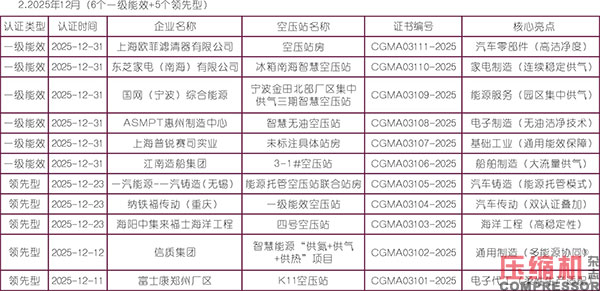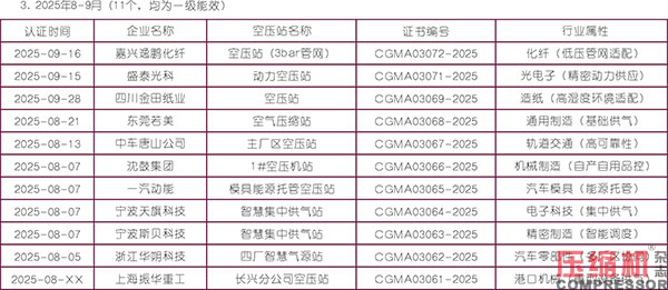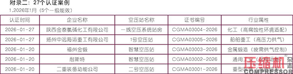 中國通用機械工業協會(CGMIA)發布的壓縮空氣站認證公示數據顯示,2025年8月-2026年1月共公示27個認證案例,其中一級能效22個、領先型5個,覆蓋12個省份/直轄市,工業密集區(長三角、珠三角)占比超60%。這為我們分析未來空壓機站的發展趨勢提供了重要依據。