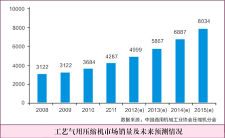 近年來,在壓縮機生產(chǎn)制造技術的大力推動下,國內(nèi)工藝氣用壓縮機發(fā)展迅猛,2008年市場銷量為3122臺,2009年市場銷量增長速度有所放緩,但期間年均增速仍保持在5%以上;2011年隨著國內(nèi)經(jīng)濟的快速恢復,國內(nèi)工藝氣用壓縮機市場強勢回升,市場銷量突破了4200臺大關。隨著工藝氣壓縮機市場的不斷拓展,下游領域需求益加迫切,行業(yè)發(fā)展仍將保持較快的增長速度,但由于行業(yè)具有較高的進入壁壘,企業(yè)進入面臨一定難度,行業(yè)還難以呈現(xiàn)爆發(fā)式的增長態(tài)勢。因此,根據(jù)近年來工藝氣用壓縮機行業(yè)發(fā)展趨勢,保守估計在"十二五"期間,國內(nèi)工藝氣用壓縮機市場仍將保持15%左右的增長速度,到2015年工藝氣用壓縮機國內(nèi)市場銷量將達到8000臺。