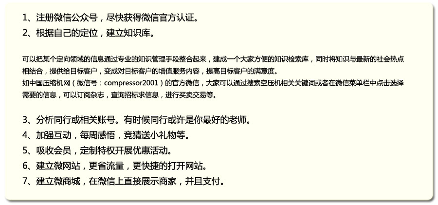 大小號助推加粉。企業可以建立2個賬號。一個作為微信私人小號,一個作為企業微信公眾平臺賬號 。微信私人小號,修改簽名為廣告語,然后再尋找附近的人進行推廣的方式。公眾帳號申請認證后 更有利于企業品牌的建設,也方便企業推送信息和解答消費者的疑問。小號可以通過主動尋找附近 的用戶來推送公眾賬號的引粉信息,以此將粉絲導入到公眾賬號中統一管理。